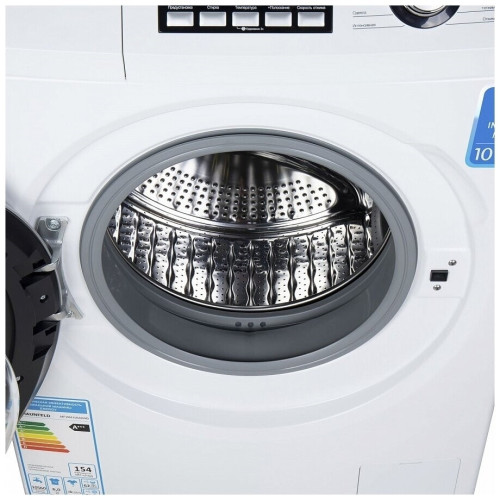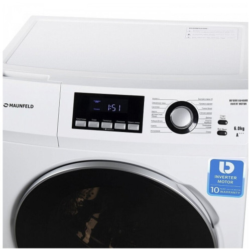 MAUNFELD MFWM10646WB отдельностоящая стиральная машина с инверторным мотором. Количество режимов стирки: 16 ( Хлопок, Смешанные ткани, Синтетика, Быстрая стирка 15, Пуховые изделия, Джинсы, Рубашки/Блузы, Шерсть, Одеяло, Тонкое белье, Летняя одежда, Интенсивная, Деликатные ткани, Полоскание+отжим, Отжим, Очистка барабана). Экологичный углепластиковый бак гарантирует максимальную тишину, значительно уменьшая вибрации, а также эффективно изолирует тепло. Электронная система балансировки загрузки гарантирует максимально равномерное распределение белья в барабане перед каждым циклом вращения. Благодаря этому, вибрация во время цикла вращения сведена до минимума, а машина работает максимально тихо.