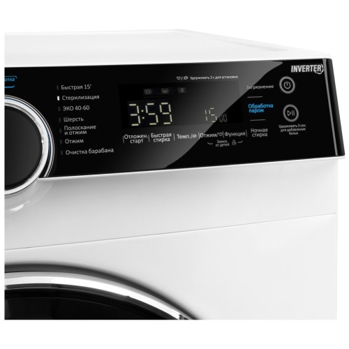 Стиральная машина с инвертором и паром Общие данные: Габариты: 85х59.6х56.5 см Максимальная загрузка: 10 кг Скорость отжима: 1500 об/мин Класс стирки: A Класс отжима: B Класс энергоэффективности: A Программы: 14 Хлопок - режим стирки для сильнозагрязненных тканей, устойчивых к высоким температурам (ткани из льна и хлопка). Синтетика - позволяет стирать синтетические и смешанные вещи. При стирке трикотажных изделий количество моющего средства должно быть минимальным. Смешанные ткани - стирка одежды одного цвета, но из разной по составу ткани. Не рекомендуется стирать белье и одежду различных цветов вместе. Постельное белье - специальная программа для стирки пододеяльников. Детская одежда - высокая температура, а также дополнительное полоскание помогают качественно выстирать вещи и избавиться от остатков моющего средства. 20C - режим стирки изделий из яркой цветной ткани для лучшей защиты цвета. Температура по умолчанию 20С, но программа позволяет установить подачу только холодной воды. Быстрая 15C - сверхкороткая программа для стирки небольшого количества вещей с лёгким загрязнением. Стерилизация - программа эффективного удаления болезнетворных бактерий. В течение 30 минут температура стирки превышает 70С. ЭКО 40-60 - режим стирки при температуре 40C, без возможности её изменения, для вещей с разрешённой температурой стирки 40-60C. Шерсть - для стирки одежды из шерсти и смесовой шерсти, подлежащей ручной и машинной стирке. Особо деликатная программа с длительными паузами для предотвращения усадки ткани. Полоскание - дополнительное полоскание с последующим отжимом. Отжим - дополнительный цикл отжима с возможностью выбора скорости. Очистка барабана - специальная программа для очистки барабана и внутренних элементов машины. Дополнительные функции: Подсветка барабана Стерилизация Программа Мой режим Ночная стирка Дополнительное полоскание Предварительная стирка Быстрая стирка Функция обработки паром Отключение звукового сигнала Добавление белья во время стирки Выбор температуры Управление и индикация: Сенсорное управление Большой информативный дисплей Функция Отложенный старт (до 24 часов) Индикация этапов Системы безопасности: Защита от детей Защита от протечек Дополнительная информация: Инверторный мотор Диаметр дверцы (мм): 480 Энергопотребеление, кВтч/год: 167 Уровень шума при стирке/отжиме, дБ: 57/79 Вес товара (брутто), кг: 76 Расход воды за цикл (л): 52 Диаметр отверстия люка (мм): 375 Открытие дверцы на 180 градусов Высококачественная сталь барабана