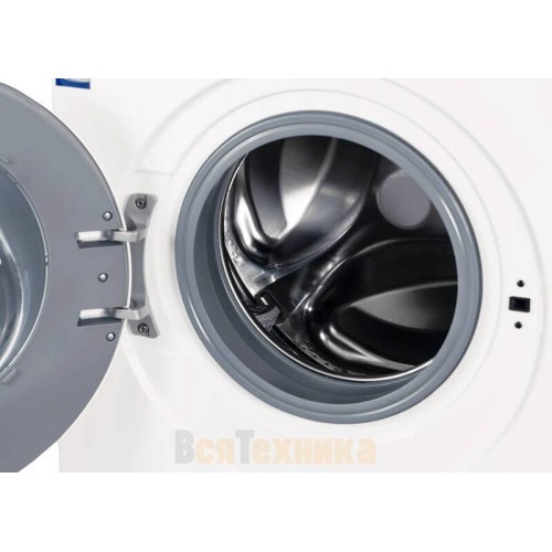 Стиральная машина выполнена в классическом белом цвете с элегантной панелью управления. Большой люк с увеличенным загрузочным окном (диаметр 34 см) облегчает загрузку объемных вещей. Цифровой дисплей с русскоязычным меню интуитивно понятен. Уровень защиты от протечек — полный (как корпуса, так и шлангов).