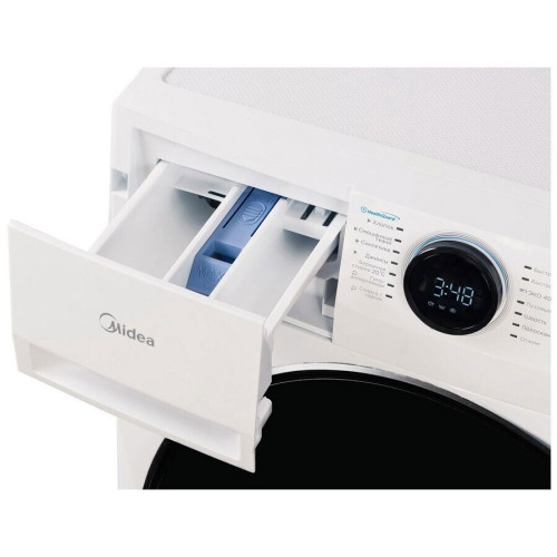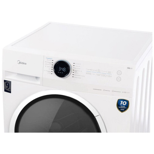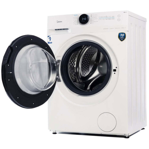 Стиральная машина Midea в белом цвете с инверторным мотором и потребляемой мощностью 1950 Вт. Объем барабана — 64 л. Диаметр люка — 33 см. Максимальный вес загружаемого сухого белья — 9 кг. Модель запрограммирована на 14 режимов работы. Есть стирка с паром, отложенный старт и автоматическая очистка барабана. Во время текущей программы возможна дозагрузка белья. Для безопасности предусмотрена функция «Блокировка от детей». Скорость отжима — 1400 об/минуту. Класс энергоэффективности обеспечивает экономный расход электроэнергии. Машинка работает тихо. При отжиме уровень шума равен 79 дБ, при стирке — 57 дБ. Управление электронное. Настройки можно вносить с помощью Wi-Fi, через приложение на смартфоне Msmarthome. Все данные отображаются на Led-дисплее.