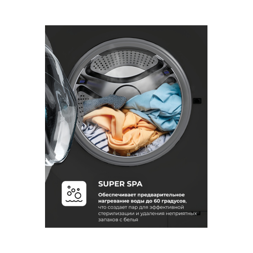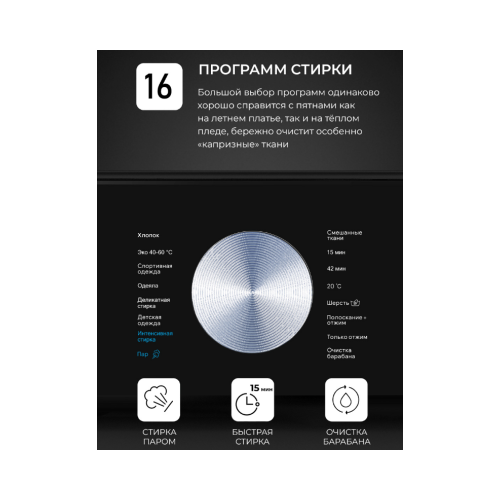 | Список программ | Быстрая/Деликатная/Детские вещи/Обработка паром/Отжим/Полоскание и отжим/Смешанные ткани/Спортивная одежда/Хлопок/Шерсть/ЭКО |