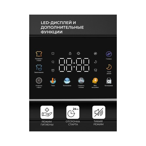 | Список программ | Быстрая/Деликатная/Детские вещи/Обработка паром/Смешанные ткани/Спортивная одежда/Хлопок/Шерсть/ЭКО |