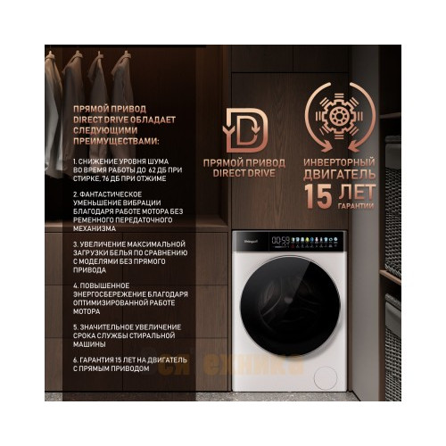 Ключевое преимущество модели — отказ от традиционного ременного привода в пользу инновационной системы Direct Drive. Мотор расположен непосредственно на барабане, что обеспечивает целый ряд выгод: