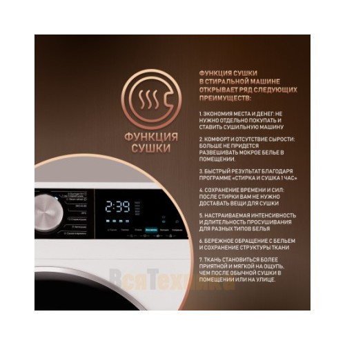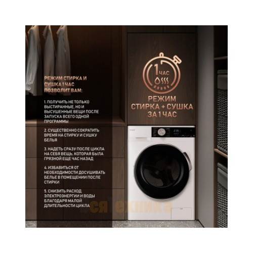 - Все в одном: Стирка и сушка в одном устройстве. Больше не нужно развешивать белье или занимать место отдельной сушильной машиной.