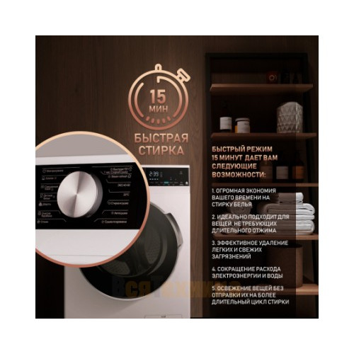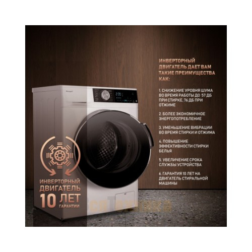- Инверторный мотор Direct Drive: Тихая, надежная и экономичная работа, прямой привод без ремней для долговечности.