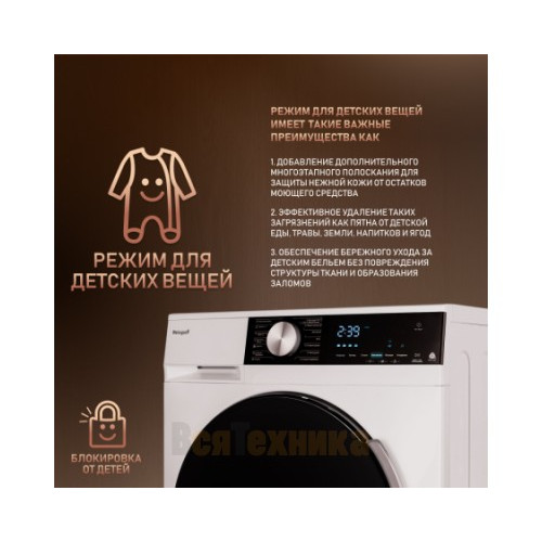 - Для семей с детьми: Функция пара и гигиеничные режимы обеспечат чистоту и безопасность детских вещей.