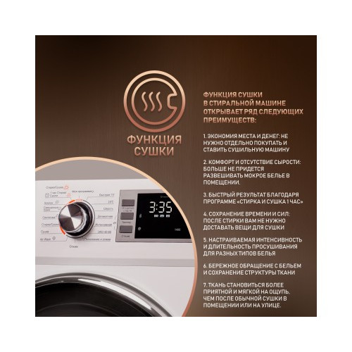 | Программы | Хлопок, Синтетика, Деликатная, Шерсть, Спорт, Быстрая, Интенсивная, Джинсы, Детская, Антиаллерген, Отжим, Сушка, Стирка+Сушка, Пуховые изделия, Шелк, Темные вещи |