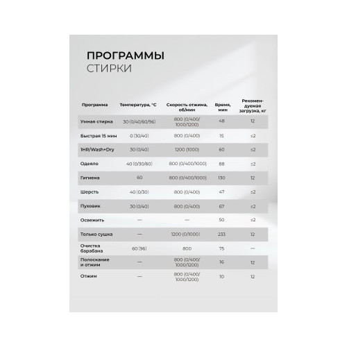 | Список программ | Быстрая/Отжим/Полоскание и отжим/Пух/Шерсть |