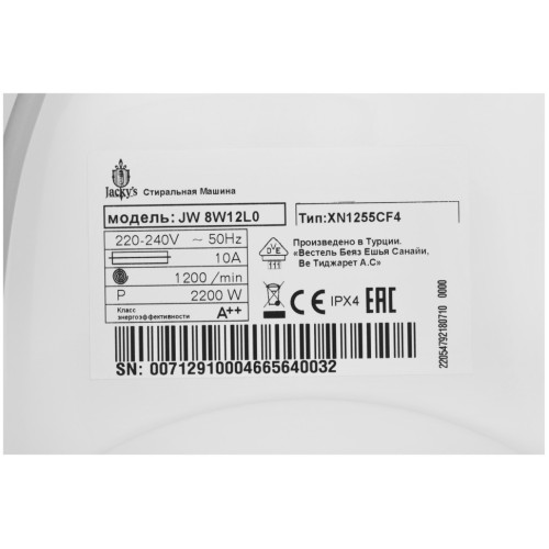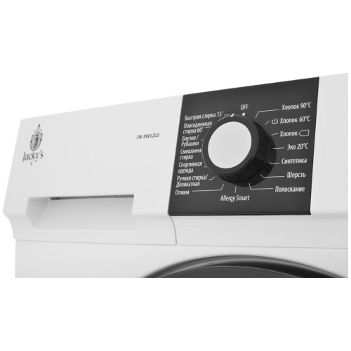 Стиральная машина Jacky’s JW8W12L0 с загрузкой 8 кг и скoростью отжима до 1200 оборотов в минуту. Великолепная модель, сочетающая в себе лаконичный английский дизайн и непревзойденное европейское качество. Pearl Drum. Жемчужный барабан обеспечит защиту вещей от износа и повреждений. Стирка вещей стала еще деликатнее. Чёрный люк с покрытием PC Cover. Данное технологическое решение спасет домочадцев от неприятных ощущений во время прикосновения к люку в процессе стирки с высокой температурой воды. Уникальное покрытие защищает его от нагрева, люк всегда остаётся прохладным или немного тёплым. Стильный затемнённый люк будет не только защитой, но также и эстетичным элементом декора, ведь в нём не видно содержимого стиральной машины. Благодаря специальному дизайну внешней части корпуса снижается вибрация во время стирки и отжима. Тихая работа стиральной машинки способствует удобному времени загрузки. Если вы не хотите получить заломы на белье, которые сложно отгладить, можно активировать функцию легкой глажки, которая отжимает белье максимально деликатно. Отгладить белье теперь не составит труда! Многофункциональный дисплей. Индикатор цикла стирки позволяет осуществлять необходимые настройки режима, а также контролировать процесс стирки и видеть информацию о каждом этапе. Увеличенный размер дверцы стиральной машины. Вам больше не придется изо всех сил пытаться вытащить белье через дверь вашей стиральной машины. Супер большая дверь значительно упрощает стирку постельных принадлежностей или одеял. Профессиональная программа против аллергии, утвержденная самой престижной организацией Англии Allergy UK. Благодаря данной программе для чувствительной кожи, белье промывается наиболее тщательно, что позволяет вывести все остатки моющих средств или загрязнений из белья. В каждой стиральной машине есть 15 программ, которые справятся с любой поставленной задачей и это помимо дополнительных функций. Любое загрязнение не страшно стиральным машинам Jacky’s. Возможность выбора температуры стирки исходя из типа белья, тем самым каждая программа может быть идеально настроена под ваши цели Система контроля дисбаланса. Неравномерная стирка может привести к повреждению барабана машины. Система управления дисбаланса аккуратно перераспределяет содержимое барабана, обеспечивая равномерную стирку и отсутствие повреждений. Выбор скорости отжима. Данная функция позволяет настроить стиральную машину под конкретный тип белья и ткани. Благодаря данной настройке вы получаете качественно отжатое белье. Отсрочка старта. Функция будет полезна в том случае, если вы хотите начать стирку в определенное время. К примеру, вы можете запустить стиральную машину за полтора часа до своего возвращения.