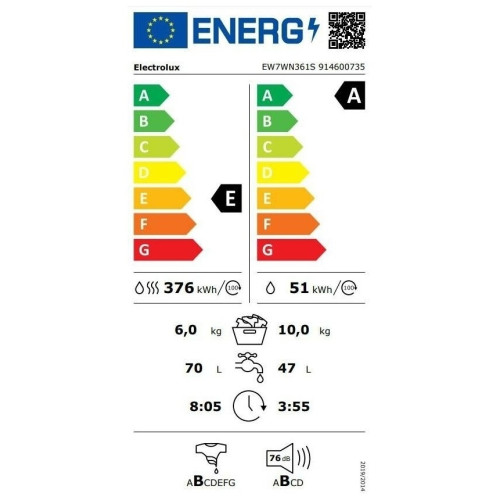 Основные характеристики - Установка: отдельностоящая - Конструкция стиральной машины: полноразмерная - Количество барабанов: 1 - Тип двигателя: инверторный Основной барабан - Тип загрузки : фронтальная - Максимальная загрузка белья: 10 кг - Максимальная скорость отжима: до 1600 об/мин - Класс стирки: B - Класс отжима: B - Уровень шума при отжиме: 76 дБ Сушка - Сушка: есть - Тип сушки: по времени - Максимальная загрузка белья при сушке: до 6 кг Управление - Тип управления: электромеханическое - Переключатели: кнопочные, поворотные, сенсорные - Размещение панели управления: под наклоном - Количество программ: 13 - Программы: эко 40-60 °С, хлопок, синтетика, деликатная стирка, шерсть, пар FreshSent, антиаллергия, спортивная одежда, верхняя одежда, джинсы, One Go 1 час 1 кг, отжим/слив, замачивание - Дополнительные программы: предварительная стирка, дополнительное полоскание, удаление пятен Температурные режимы - Регулировка температуры стирки: да Дисплей - Цифровой дисплей: да Таймер - Таймер отсрочки: да - Максимальное время отсрочки стирки: 20 ч Индикация - Звуковой сигнал завершения программы: да - Индикация времени до конца программы: да - Индикация температуры: да - Индикация скорости отжима: да - Индикация блокировки дверцы: да - Индикация ошибок: да - Индикация цикла стирки: да Расход воды - Расход воды за цикл: 70 л Отжим - Регулировка скорости отжима: да - Отмена отжима: да Защита и безопасность - Защита от детей: да - Защита от протечек: частичная - Блокировка люка во время работы: да - Контроль пенообразования: да Энергопотребление - Класс энергопотребления: A - Энергопотребление за цикл: 3.76 кВт/ч Особенности конструкции - Направление открывания люка: влево Дополнительные функции - Автобаланс: да - Дополнительная информация: функция самоочистки Цвет и материал - Цвет: белый - Цвет дверцы люка: чёрный Комплектация - Инструкция: да Размеры и вес - Высота: 84.7 см - Ширина: 59.7 см - Глубина: 63.1 см - Вес: 78 кг