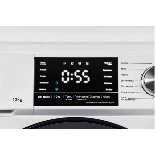 Отдельностоящая стиральная машина HIBERG i-DDQ6A - 1214 W с инверторным мотором и системой прямого привода отстирывает до 12 кг сухого белья за 1 цикл. Стиральная машина с высшим классом энергоэффективности А+++. Инверторный мотор и прямой привод обеспечивают практически бесшумную работу двигателя и повышенную устойчивость конструкции с минимальными затратами ресурсов. Двигатель стиральной машины не нуждается в техническом обслуживании и периодической смазке. Панель управления: Сенсорное управление с механическим диском позволяет выбрать необходимую программу с предустановленными настройками, отрегулировать температуру и скорость отжима. LED-дисплей со световой индикацией. Стиральная машина имеет 14 автоматических программ, полезные дополнительные функции, а также датчики контроля дисбаланса и пенообразования. Программы стирки: В стиральной машине можно стирать смешанные и синтетические ткани, отдельно темные и цветные, блузки и рубашки, детские, шерстяные вещи и пуховое одеяло. В стиральной машине используется технология 7 алгоритмов вращения барабана для бережной и эффективной стирки. Машина сама выбирает сочетание алгоритмов и задает оптимальный режим в зависимости от типа ткани и объема белья. Функция i-DOS позволяет автоматически определять вес одежды и разумно контролировать подачу стирального порошка и кондиционера для белья. Система i-DOS может хранить достаточное количество жидкого моющего средства и смягчителя до 50 стирок. Режим быстрой стирки длительностью 15 минут подходит для слабозагрязненных вещей, а программа деликатной стирки для нижнего белья и шелковой одежды, подходящей для машинной стирки. Антибактериальная стирка позволяет быстро избавиться от микробов, грязи и неприятных запахов, придав белью свежесть и прежний лоск. Функция «Отсрочки старта» позволяет выбрать желаемое время окончания стирки с шагом в 1 час до 24. Функция «Без складок» сводит к минимуму образование складок за счет пропуска промежуточного отжима и дополнительного объема воды при полоскании. Вещи после стирки с легким разглаженным эффектом практически не требуют глажки после высыхания. Функция «Замачивание» подходит для сильно загрязненных вещей. По времени такая стирка занимает от 60 до 120 минут. Предварительная стирка предполагает замачивание вещей с застарелой и въевшейся грязью вместе с моющим средством, после чего включается основной цикл стирки. Функция дозагрузки белья позволяет добавить или вынуть белье из барабана, когда программа стирки уже запущена. В случае сбоя электропитания, благодаря функции памяти, стиральная машина запомнит, на каком моменте был остановлен цикл стирки и при включении продолжит работу с него. Очистка барабана – программа, для удаления грязи и бактерий из барабана, которые могут появляться при регулярной стирке при низких температурах. Функция «Замок от детей» блокирует панель управления во время работы, тем самым защищая от случайного открытия дверцы и изменения настроек детьми. Подсветка барабана включается во время установки программы или функции, а также при смене этапа стирки, при открытии дверцы и касании к любой кнопки на панели управления. Манжета люка имеет нано-антибактериальное покрытие, которое исключает появление неприятных запахов, предотвращает размножение бактерий и обра