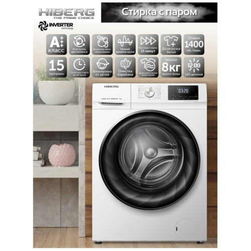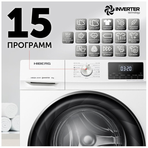 Высокотехнологичная, надежная, стильная и современная стиральная машина HIBERG i-WHQS4 – 814 W обладает главным преимуществом – инверторным мотором. Он работает тише стандартного, а так же отличается долговечностью и ресурсосбережением. Полноразмерная стиральная машина, глубиной 54 см и с фронтальным типом загрузки рассчитана на то, что вы с легкостью отстираете до 8 кг сухого белья. Высший класс энергоэффективности А +++ характеризуется низким потреблением воды и электричества. Машинка потребляет до 51 л воды за цикл стирки с максимальной скоростью отжима 1400 оборотов в минуту. Модель оснащена механическим переключателем программ с заранее установленными настройками, а с помощью кнопок можно отрегулировать температуру и время стирки. На LED дисплее отражается вся информация по режиму, часы, а так же срок завершения стирки, закрытого люка, количество оборотов, температуру, время окончания отложенной стирки и замачивания. Стиральная машина имеет 15 автоматических программ. Вы можете стирать деликатные ткани, отдельно темные и цветные, блузки и рубашки, спортивные, детские и шерстяные вещи. Но есть главное достоинство модели - стирка с паром, которая позволит уничтожить бактерии и аллергены, а так же придаст белью свежесть, разгладит складки и удалит неприятные запахи. Стиральная машина автоматически взвешивает белье, чтобы определить оптимальное количество воды для цикла стирки. Датчик контроля пенообразования подаст сигнал машине, чтобы насос откачал лишнюю пену с барабана, тем самым повышая качество полоскания и во избежание выхода машинки из строя. Возможность отложить старт на определенный период от 3 до 24 часов, позволяет запустить машинку в более удобное время. Функция дозагрузки белья позволит вам одним нажатием кнопки на панели управления доложить вещи в любой момент. Замачивание - еще один большой плюс в модели, подходит для сильно загрязненных вещей. Кроме того, теперь есть возможность добавить в «Избранное» те настройки, на которых чаще всего проходит стирка. Режим «Без шума» позволит стирать даже ночью, сохраняя тишину, все уведомляющие звуки будут отключены. Функция «Замок от детей» блокирует устройство во время работы, тем самым защищает от случайного открытия дверцы и изменения настроек детьми. Барабан выполнен из прочной высококачественной нержавеющей стали с функцией самоочищения, а его специальный рельеф обеспечивает тщательную и бережную стирку. Корпус машинки защищен от протечек и перелива, что гарантирует полную безопасность во время стирки. Особенности и преимущества: - цвет корпуса белый, люк черный; - глубина 54 см; - загрузка: 8 кг; - 15 программ для стирки; - механическое управление с LED дисплеем; - стирка с паром; - бесшумный режим; - контроль дисбаланса; - контроль пенообразования; - блокировка от детей; - экономичное потребление воды; - низкий уровень шума. Доверьте качественную и бережную стирку стиральной машинке премиум класса HIBERG i-WHQS4 – 814 W.