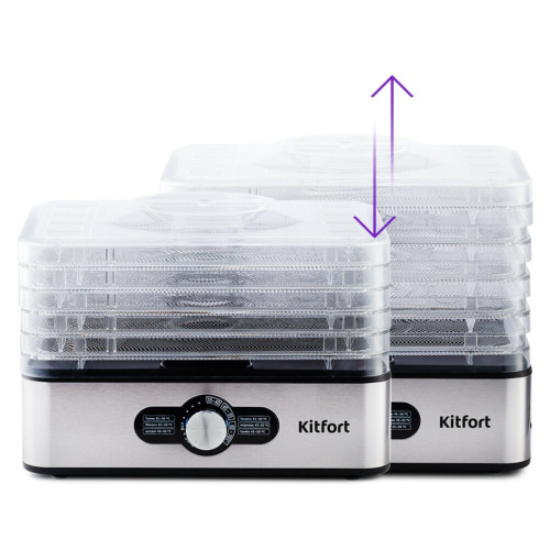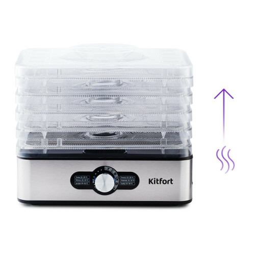 С электросушилкой Kitfort KT-1913 у вас под рукой будет всегда живая еда. Прибор насушит на зиму фрукты, овощи, ягоды, грибы, зелень, а также мясо, рыбу, пастилу и многое другое. Это не только вкусно, но и полезно! Благодаря компактному корпусу и оптимальному количеству поддонов сушилка для овощей и фруктов не займёт много места у вас на кухне.На передней панели есть регулятор, с помощью которого вы можете установить температуру в диапазоне 35-70 °C. Сушилка имеет в комплекте 5 вместительных поддонов с сеткой из нержавеющей стали и прозрачными стенками, поэтому вы легко сможете наблюдать за процессом сушки.В сушилке установлен мощный нагревательный элемент и вентилятор, обеспечивающий распределение нагретого воздуха по всему объёму камеры. Горячий воздух подаётся снизу вверх.Поддоны можно установить в двух положениях по высоте: компактно и с удвоенной высотой в зависимости от размеров высушиваемых продуктов.