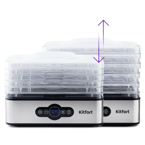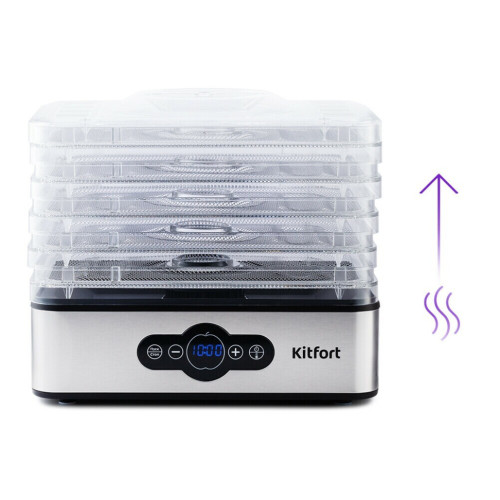 С электросушилкой Kitfort KT-1914 у вас под рукой будет всегда живая еда. Прибор насушит на зиму фрукты, овощи, ягоды, грибы, зелень, а также мясо, рыбу, пастилу и многое другое. Это не только вкусно, но и полезно! Благодаря компактному корпусу и оптимальному количеству поддонов сушилка для овощей и фруктов не займёт много места у вас на кухне.На передней панели устройства есть регулятор, с помощью которого вы можете установить температуру в диапазоне 35-70 °C с шагом в 5 градусов, а также таймер до 99 часов с шагом в 30 минут. Сушилка имеет в комплекте 5 вместительных поддонов с сеткой из нержавеющей стали и прозрачными стенками, поэтому вы легко сможете наблюдать за процессом сушки. В сушилке установлен мощный нагревательный элемент и вентилятор, обеспечивающий распределение нагретого воздуха по всему объёму камеры. Горячий воздух подаётся снизу вверх. Поддоны можно установить в двух положениях по высоте: компактно и с удвоенной высотой в зависимости от размеров высушиваемых продуктов.