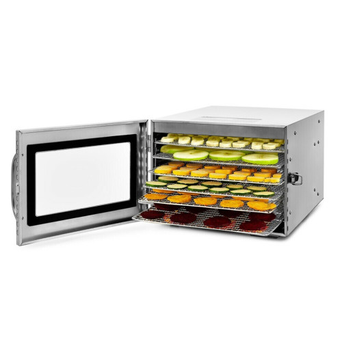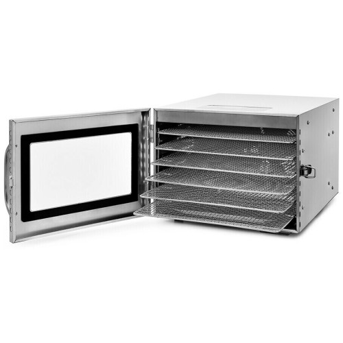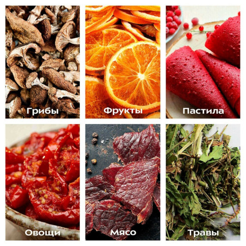 Электрическая сушилка предназначена для сушки овощей, фруктов, ягод, грибов, корнеплодов, трав и зелени, а также мяса и рыбы, хлеба. Сушилка имеет в комплекте 6 поддонов для сушки и 1 поддон для жидкости. Поддоны выполнены из нержавеющей стали. В сушилке установлен мощный нагревательный элемент и вентилятор большого диаметра, обеспечивающий равномерное распределение нагретого воздуха по всему объему камеры. Благодаря горизонтальному обдуву смешение запахов при сушке одновременно разных продуктов минимально. На сушилке можно установить температуру сушки в диапазоне 35-75 °С с шагом 5 градусов. Сушилка оснащена таймером до 24 часов работы с шагом 30 минут.