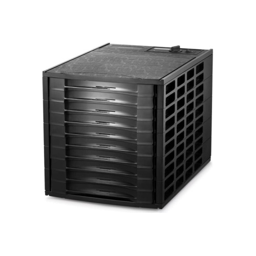 Сушилка для овощей и фруктов KITFORT КТ-1923 поможет насушить на всю зиму овощи, фрукты, ягоды, грибы, корнеплоды, зелень и хлеб. На сушилке можно установить температуру сушки в диапазоне 30–70 °С с шагом 1 °С. У регулятора плавное переключение температуры. Сушилка оснащена таймером до 40 часов 59 мин работы с шагом 1 час. В сушилке установлен мощный нагревательный элемент и вентилятор с лопостями большого диаметра. Это обеспечивает равномерный горизонтальный обдув всех 10 поддонов. Таким образом запахи продуктов с разных поддонов не смешиваются. В комплекте с сушилкой идут 10 пластиковых сетчатых поддонов. У них предусмотрены скрытые ручки, за которые удобно держать поддоны во время их перемещений и установки. Вместительная сушилка имеет строгий дизайн и оригинальный характер поверхности верхней панели.