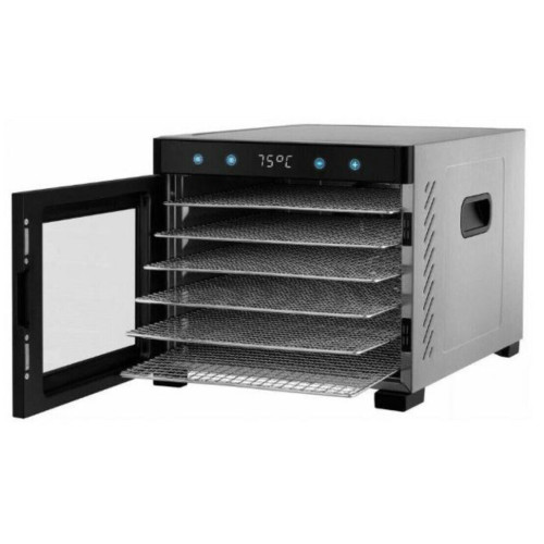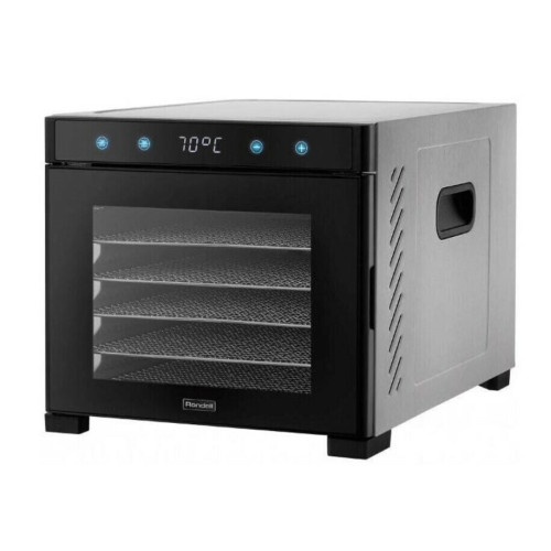 Сушка для фруктов Rondell RDE-1750 вмещает шесть решеток, сделанных из нержавеющей стали. Размеры — 30,5х33 см. Жидкость собирается в отдельный поддон. Элементы съемные и могут очищаться в посудомоечной машине. Воздух в камере нагревается до температуры в диапазоне от 35°C до 75°C и равномерно распределяется вентилятором. Тип обдува — горизонтальный. Прорезиненные ножки обеспечивают устойчивость, ручки — легкость транспортировки. Управление полностью сенсорное. С помощью кнопок настраиваются параметры таймера на срок до 24 часов. При перегреве устройство выключается автоматически. Потребляемая мощность — 650 Вт. Корпус изготовлен из металла черного и серебристого цветов. Габариты — 35х30 см. Вес — 8,8 кг.