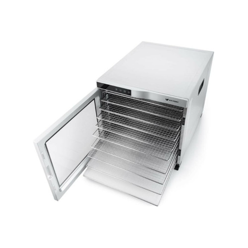 Сушилка для овощей и фруктов мощность 1000 Вт КТ-1910 насушит помидоры, кабачки, баклажаны, абрикосы, зелень, мясо и многое другое. Сушилка оборудована большим мощным вентилятором, что обеспечивает равномерный горизонтальный обдув всех 10 поддонов. Поток воздуха направлен горизонтально, так что запахи продуктов с разных поддонов не смешиваются. На сушилке можно установить температуру сушки в диапазоне 35-75 °С с шагом 5 градусов. Сушилка оснащена таймером до 24 часов работы с шагом 30 минут. 10 металлических поддонов, 10 подоннов с бортиками для пастилы и 10 сеток помогут разместить внутри любые продукты. Прибор имеет строгие формы, минималистичный стильный дизайн, а также полностью металлическое исполнение и удобные ручки для переноски. Через прозрачную дверцу из закалённого стекла можно наблюдать за процессом сушки.