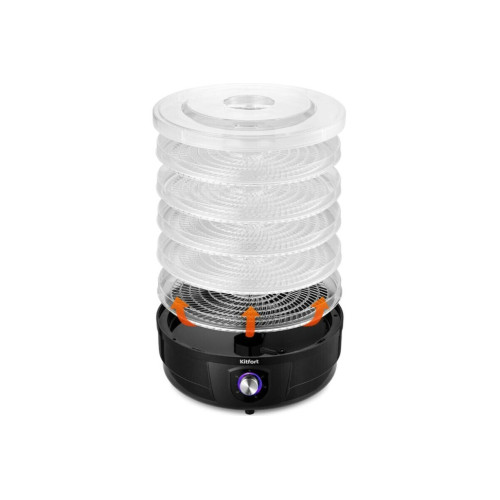 Сушилка для овощей и фруктов KITFORT КТ-1928 предназначена для сушки овощей, фруктов, ягод, грибов, корнеплодов, трав и зелени, а также хлеба. Прибор создает идеальные условия для качественной сушки продуктов. В сушилке установлен вал, благодаря которому поддоны вращаются вокруг своей оси, что обеспечивает идеальную сушку продуктов. На передней панели устройства есть регулятор, с помощью которого вы можете включить и выключить устройство, установить температуру в диапазоне от 40 до 70°C. Регулятор имеет плавное переключение температур. Сушилка имеет в комплекте 5 поддонов из прозрачного пластика, поэтому вы легко можете наблюдать за процессом сушки любимых продуктов. Устанавливайте от 1 до 5 поддонов друг на друга в зависимости от количества продуктов. Сушилка оборудована мощным нагревательным элементом и вентилятором, благодаря которым нагретый воздух равномерно распределяется по всему объему камеры. Все поддоны легко снимаются и моются после сушки. Если на поддоны налипли продукты, замочите их на некоторое время в теплой воде. После мойки протрите поддоны полотенцем и просушите их. Для более быстрой сушки порежьте продукты на кусочки. Чем мельче кусочки, тем быстрее они высохнут. При сушке ягод и прочих мелких продуктов положите на поддоны марлю, чтобы ягоды не проваливались сквозь ячейки.