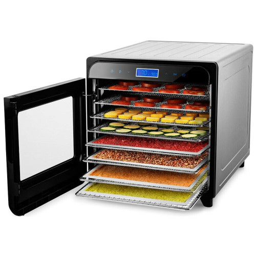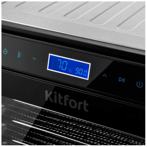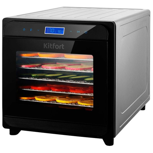 Вместительная электрическая сушилка Kitfort КТ-1934 предназначена для сушки овощей, фруктов, ягод, грибов, корнеплодов, трав и зелени, а также мяса и рыбы, хлеба. С помощью специальных сплошных поддонов можно готовить пастилу. Особенности: Равномерная горизонтальная сушка В сушилке установлен мощный нагревательный элемент и вентилятор, обеспечивающий равномерное распределение нагретого воздуха по всему объёму камеры. Благодаря горизонтальному обдуву смешение запахов при сушке одновременно разных продуктов минимально. Регулировка температуры и времени сушки На сушилке можно устанавливать температуру сушки в диапазоне 35-75°C с шагом 5 градусов. Сушилка также оснащена таймером до 24 часов с шагом 1 час. Для вашего удобства необходимые время и температуру сушки различных продуктов мы указали в инструкции. Полный комплект на все случаи! В комплекте к сушилке идут: 8 металлических сетчатых поддонов для сушки фруктов, овощей, мяса; 8 пластиковых сетчатых поддонов для сушки небольших продуктов (травы и ягоды); 8 пластиковых сплошных поддонов для сушки водянистых продуктов и пастилы. Вместительный и компактный корпус Прибор имеет строгие формы, минималистичный стильный дизайн. Корпус сушилки выполнен из металла, а дверца выполнена из сочетания стекла и металла. Через стекло в дверце можно следить за процессом сушки.