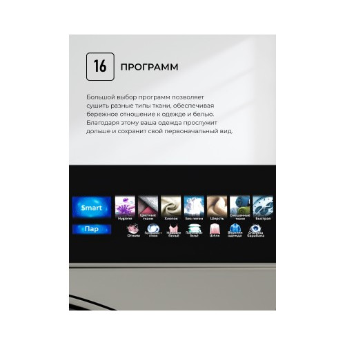 | Дополнительные программы | Smart/UV обработка/Без складок/Верхняя одежда/Нижнее бельё/Освежение/Сушка на полке/Сушка по времени |