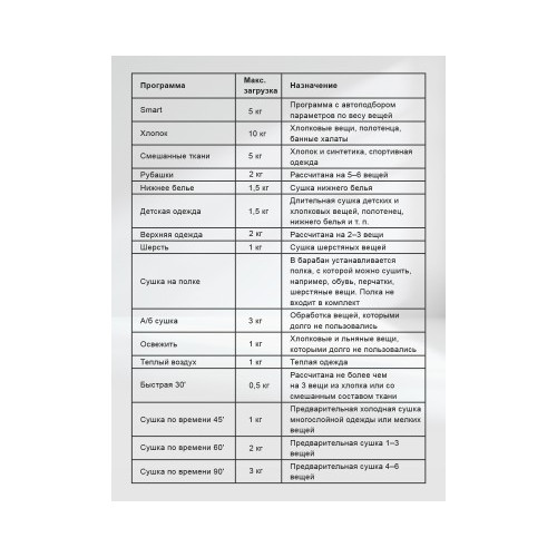 | Список программ | Быстрая/Детские вещи/Рубашки/Смешанные ткани/Хлопок/Шерсть |