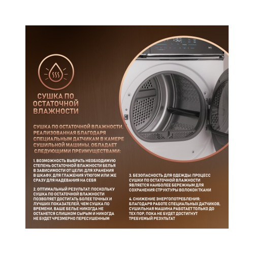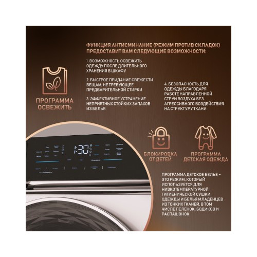 - Дополнительные программы: Ускоренная/Сушка по остаточной влажности