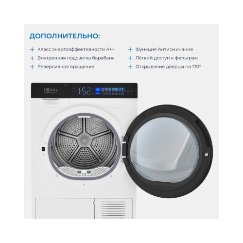 | Дополнительные особенности | Большой премиальный люк с хромированным ободом и диаметром 34 см/Возможность подключения к сливу/Открывание дверцы на 170°/Подсветка барабана/Регулировка уровня сушки и времени сушки/Ультрафиолет |