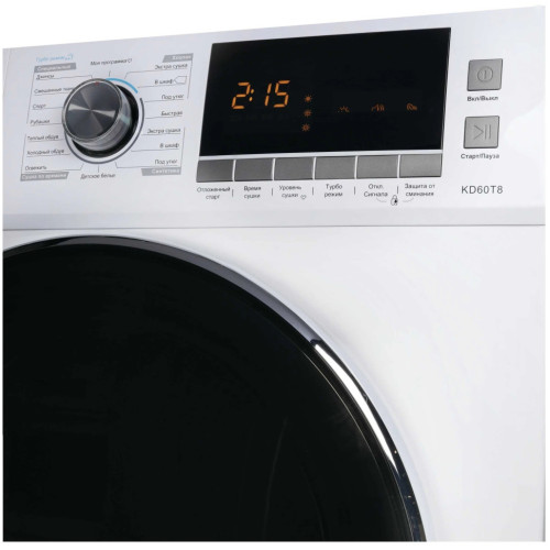 Съемный резервуар для слива конденсата Сушильный барабан оснащён специальным резервуаром, где остается конденсат после сушки белья. Вы можете поставить и пользоваться прибором в помещениях без оборудования для слива. Функция «Отложенный старт» В некоторых случаях необходимо отложить включение прибора на несколько часов, чтобы, например, сэкономить на тарифах электроэнергии или завершить процесс к определенному времени. Отложенный старт позволяет запрограммировать прибор на автоматическое включение в нужное время. Режим «Турбо» При использовании турбо режима Вы можете сократить продолжительность программы, когда необходимо завершить процесс быстрее. При этом машина не исключает полностью какие-либо этапы программы, а понемногу сокращает время каждого из циклов, что не сказывается на ожидаемом результате. Функция «Защита детей» Чтобы любимое чадо не вмешивалось в процесс работы программы, есть возможность блокировки управления. При этой функции недоступны для нажатия любые кнопки кроме выключения машины. Функция «Защита от сминания» Не всегда получается достать бельё сразу после сушки из-за различных забот. Чтобы высушенное белье не сминалось в сушильном барабане, включите функцию защиты от сминания, и машина будет периодически разрыхлять белье до тех пор, пока Вы его не заберете. Режим «Моя программа» Вы можете создать свою программу стирки с необходимой температурой, скоростью оборотов при отжиме, и дополнительными функциями. Сохранённая Вами программа всегда будет под рукой на самом верхнем положении регулятора.
