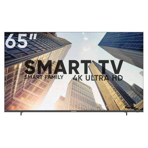 Soundmax SM-LED65M01SU - новый уровень качества телевизора 4K Smart TV на базе операционной системы Android 11 OS Family. Невероятно четкое изображение, мощный звук и удобное использование. Модель SM-LED65M01SU оснащена передовыми технологиями, которые гарантируют ни с чем не сравнимые впечатления от просмотра. Телевизор имеет изысканный дизайн, безрамочный экран, стильные и устойчивые ножки, не скользящие по тумбе под телевизор, гармонично впишется в любой интерьер. Встроенная мультимедийная платформа OS Family (фильмы и сериалы онлайн, более 400 ТВ-каналов, тысячи фильмов и сериалов от ведущих мировых студий). Вам просто нужно подключить телевизор к Интернету, и вы можете смотреть более 100 телеканалов. А встроенный WI-FI позволит вам обойтись без дополнительных проводов. Здесь вы найдете сотни радиостанций и самые популярные видеоклипы. Наслаждайтесь просмотрами любимых фильмов и сериалов без приставки, встроенный цифровой тюнер DVB-T/T2/C/S/S2 позволяет принимать 99 аналоговых и 700 цифровых каналов. Модель имеет диагональ 43 дюйма, может быть установлена на поверхность с помощью специальной подставки или крепится на стену. Имеет яркое, контрастное изображение благодаря 4K разрешению экрана 3840 на 2160 пикселей и широкими углами обзора по вертикали и горизонтали – до 178 градусов. Возможность воспроизведения аудио-, фото- и видеофайлов через USB. Система D-LED прямая подсветка обеспечивает отсутствие перепадов яркости. Производители уже настроили температуру цвета экрана и контрастность, а также урегулировали кривую звука, что бы вы окунулись в качественный просмотр с первого включения.