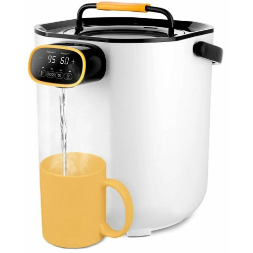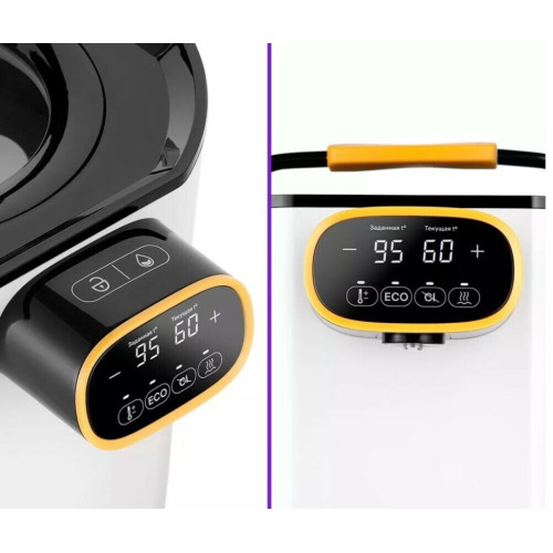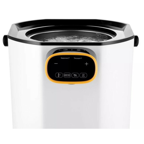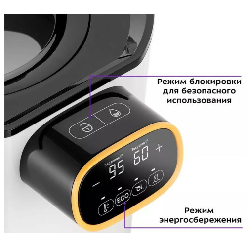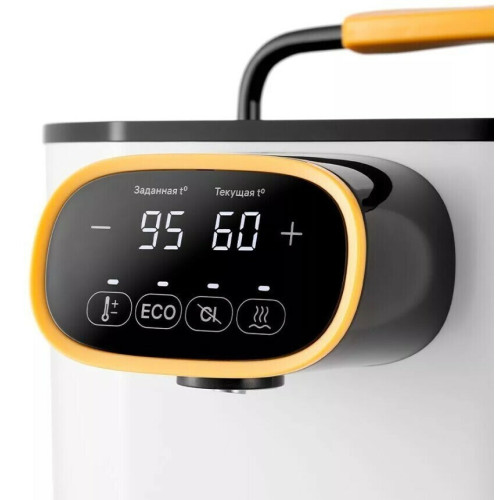 Термопот КТ-2520 служит для кипячения и нагрева воды до заданной температуры, а также поддержания температуры воды с помощью периодического включения и отключения нагрева. Из прибора удобно наливать воду благодаря автоматической подаче воды. Дисплей показывает заданную и текущую температуру. Термопот оснащен функцией выбора температуры и может не только вскипятить воду, но и нагреть ее до температуры от 40 до 95 °С с шагом 1 °С. Кнопка «Температура» включает режим поддержания температуры. Кнопка «Дехлорирование» включает длительное кипячение воды для уменьшения содержания растворенного в воде хлора. В этом режиме вода нагревается до 100 °С и будет кипеть 5 минут. Двойные стенки термопота помогают сохранить тепло и реже включать нагрев, что поможет сэкономить на электроэнергии. Корпус термопота состоит из пластика, а резервуар для воды — из нержавеющей стали. Ёмкость резервуара 5 литров. Часть крышки прозрачная, это позволяет следить за уровнем воды в резервуаре. Термопот КТ-2881 оснащен удобной ручкой для переноски. Нажмите на кнопку «ЕСО». Когда в помещении, где находится термопот, станет темно, прибор автоматически выключится. Термопот включится автоматически, когда в комнате станет светло. Блокировка кнопки подачи воды не позволит случайно включить подачу. Для продления срока службы термопота удаляйте накипь по мере ее образования. Храните термопот в сухом и прохладном месте, недоступном для детей. Не используйте для мытья абразивные моющие средства. Не погружайте устройство в воду или под струю воды.