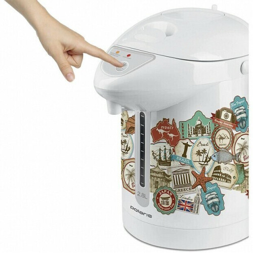 Термопот POLARIS PWP 2821 Travel – это гарант горячей питьевой воды 24 часа в сутки в Вашем доме, на даче и на пикнике. Повторное кипячение и поддержание температуры Когда вода закипает, индикатор нагрева «HEATING» гаснет, и загорается индикатор активации функции KEEP WARM – поддержания температуры. Для повторного кипячения воды необходимо нажать кнопку «REBOIL». В отключенном состоянии термопот поддерживает температуру при закрытой крышке. Вода остается теплой до 4-х часов при максимальном заполнении внутренней колбы, созданной из высококачественной нержавеющей стали. 3 способа розлива Розлив воды из POLARIS PWP 2821 Travel осуществляется тремя разными способами. Нажатие соответствующей кнопки активирует автоматический розлив. При включенном в сеть термопоте можно наливать воду путем нажатия кружкой на специальный рычажок, который находится за носиком для розлива. При отсутствии электропитания можно пользоваться ручной помпой.