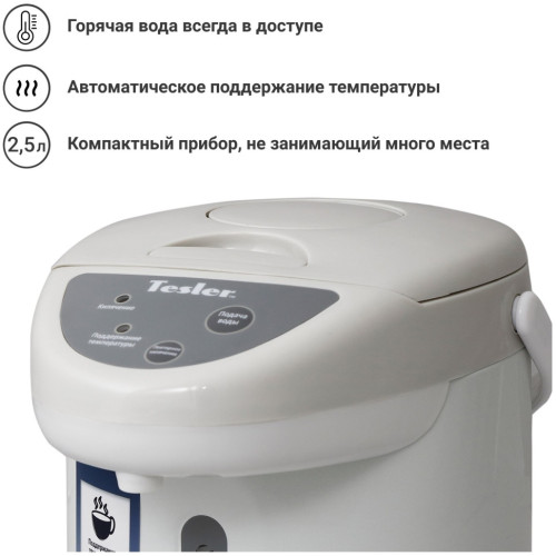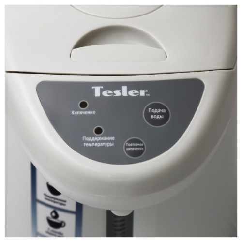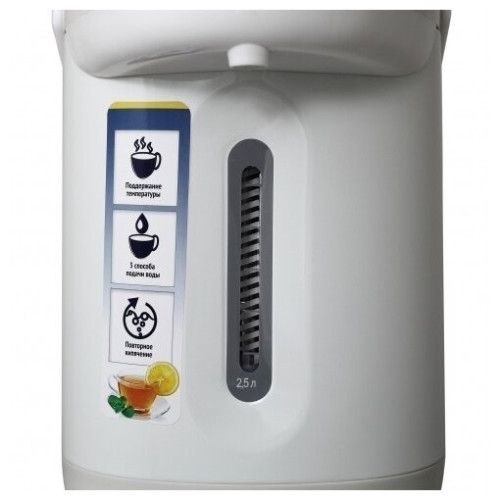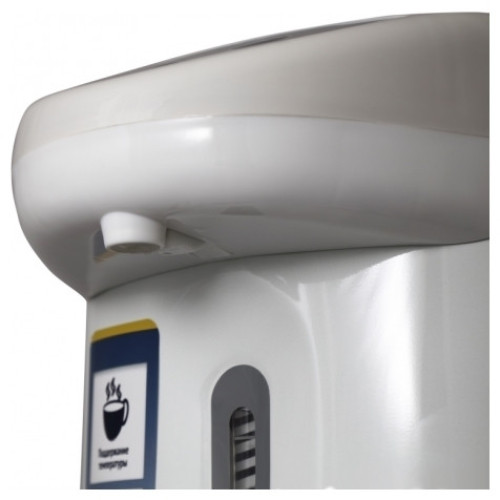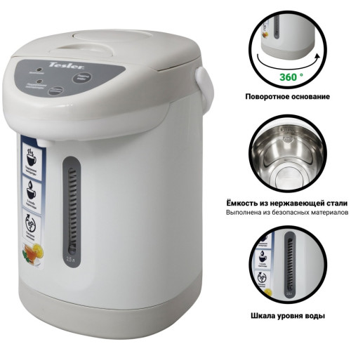 Электрический термопот с автоматическим кипячением имеет 2 режима поддержания температуры: 95°, 85°. Подаёт воду 3 способами, оснащён блокировкой ручного насоса, блокировкой панели управления и съёмной крышкой. Поворотное основание вращается на 360°. Внутренняя ёмкость и корпус изготовлены из нержавеющей стали. Дополнен подсветкой уровня воды.