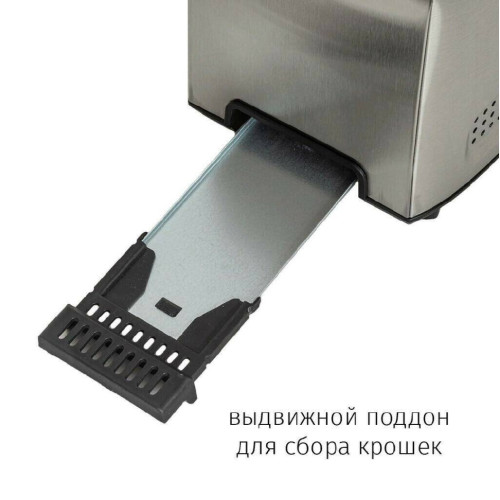 Стильный и лаконичный тостер JK-TS626 от бренда JVC мощностью 750 Вт на 2 тоста с 7 уровнями поджаривания, функцией автоотключения, функцией подогрева и размораживания станет вашим помощником на пути к идеальному завтраку. Стильный корпус выполнен из нержавеющей стали. Он прост в управлении и будет отлично смотреться как в классическом, так и в современном интерьере кухни. Тостер оснащен: *  2 отделениями для тостов; * решеткой для подогрева булочек; * удобным выдвижным поддоном для сбора крошек; * отсеком для хранения шнура; * противоскользящими резиновыми ножками. * в приборе предусмотрена кнопка отмены, вы можете остановить поджаривание до автоматической остановки разогрева.