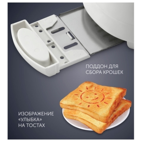 Polaris PET 0702L готовит по два тоста одновременно и даёт возможность выбрать желаемую степень их прожарки. Тостер «умеет» не только запекать ломтики хлеба. Устройство с лёгкостью разогреет ароматную булочку на выдвигающейся решётке и даже разморозит продукты. Озорные смайлики на готовых тостах поднимут настроение на весь день. Корпус не нагревается в процессе работы, обеспечивая безопасное комфортное использование. Кнопка «Отмена» будет полезной в случае, если необходимо быстро приостановить задачу. От рассыпания крошек убережет специальный поддон, который легко очищается.