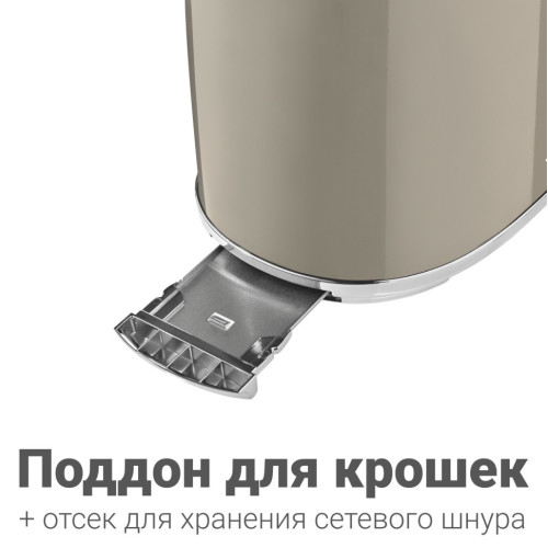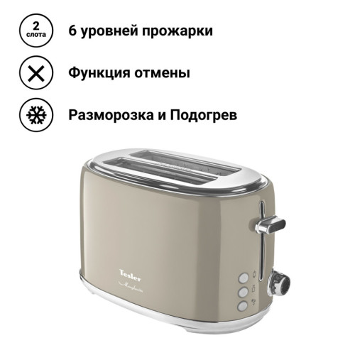 Любите побаловать себя вкусным и полезным завтраком? Тогда обратите внимание на тостер TESLER TT-255 из линейки кухонных приборов Margherita. Он оснащен двумя отсеками для хлеба, поэтому процесс приготовления не займет много времени. А автоматическое центрирование хлеба обеспечит его равномерную прожарку. Потребляемой мощности (900Вт) и 6 уровней поджаривания достаточно для того, чтобы сделать тосты, полностью соответствующими вашим предпочтениям. Но даже если вы ошиблись в выставленном режиме, то выручит кнопка отмены. С помощью прибора можно также подогреть или разморозить хлебобулочные изделия. Проблемой в использовании тостеров являются крошки, но с моделью TESLER она не может возникнуть: достаточно вынуть съёмный поддон и вытряхнуть его. Для хранения сетевого шнура предусмотрен специальный отсек, а прорезиненные ножки предотвратят скольжение. В случае перегрева тостер автоматически отключится, что защитит его от преждевременной поломки. Нержавеющая сталь, из которой выполнено устройство, гарантирует долгий срок службы.