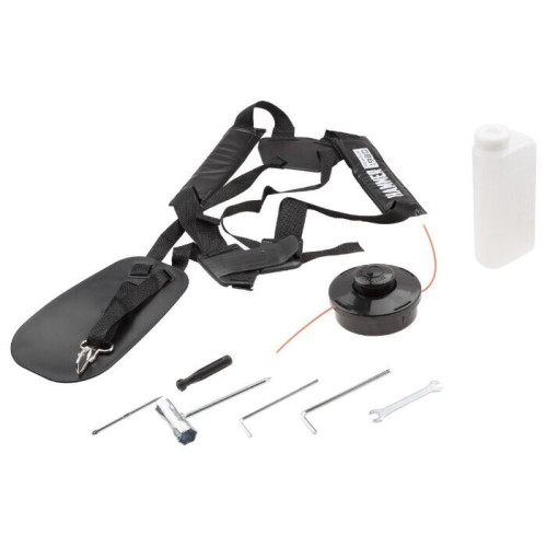 тип триммера: переносной мощность ДВС 2.1 л.с. двухтактный двигатель емкость топливного бака 1.2 л ширина скашивания 46 см режущий элемент триммера: леска и нож, леска 2.40 мм конструкция штанги: прямая форма рукояти: Т-образная (велосипедная) плечевой ремень наличие колес: нет подробная комплектация: -триммер; -катушка с леской; -нож для травы; -ремень подвесной; -мерная канистра для смешивания топливной смеси; -ключи для монтажа и обслуживания; -инструкция. вес 8.1 кг