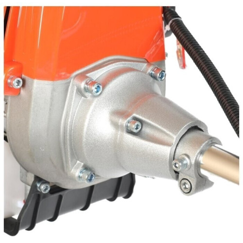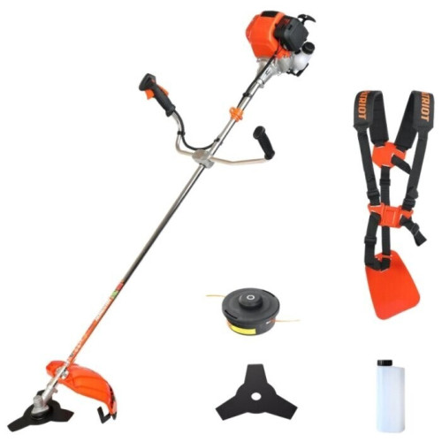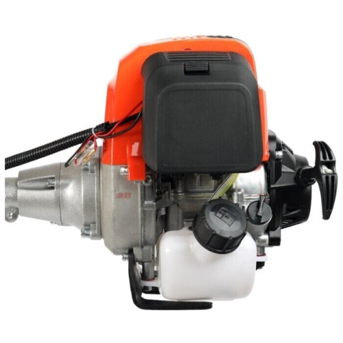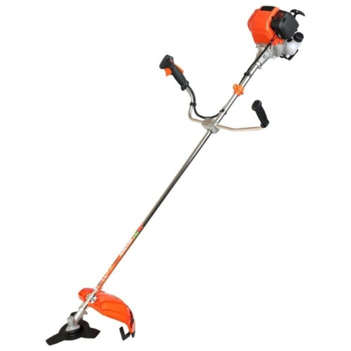 тип триммера: переносной мощность ДВС 1.3 л.с. четырехтактный двигатель емкость топливного бака 1 л ширина скашивания 42 см режущий элемент триммера: леска и нож, леска 2.40 мм конструкция штанги: прямая форма рукояти: Т-образная (велосипедная) плечевой ремень наличие колес: нет вес 7.8 кг