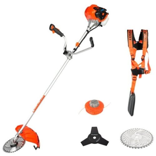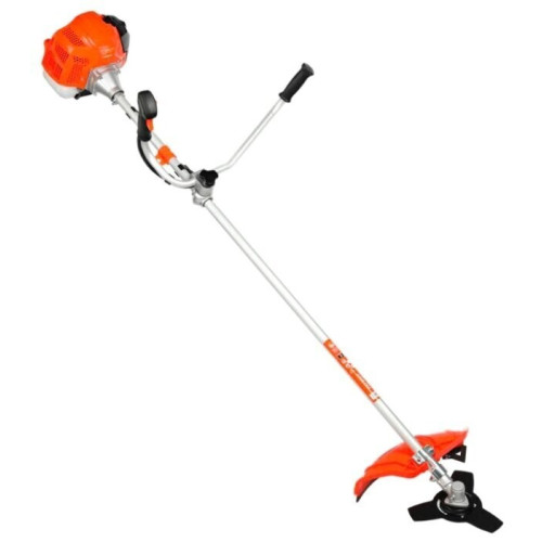тип триммера: переносной мощность ДВС 2.5 л.с. емкость топливного бака 1 л ширина скашивания 46 см режущий элемент триммера: леска и нож, леска 3 мм конструкция штанги: прямая форма рукояти: Т-образная (велосипедная) плечевой ремень наличие колес: нет вес 8.5 кг