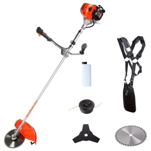 тип триммера: переносной мощность ДВС 3 л.с. двухтактный двигатель емкость топливного бака 1.2 л ширина скашивания 42 см режущий элемент триммера: леска и нож, леска 2.40 мм конструкция штанги: прямая форма рукояти: Т-образная (велосипедная) плечевой ремень наличие колес: нет вес 7.7 кг