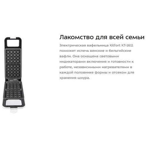 Вафельница Kitfort КТ-1611 станет незаменимой помощницей на вашей кухне. Представленная модель с простым и надёжным механическим управлением проста и удобна в использовании. Благодаря панели для приготовления бельгийских вафель, которая есть в комплекте, вы сможете сразу после покупки готовить вкусные лакомства. На панели для приготовления нанесено антипригарное покрытие, что в значительной степени облегчает уход. Комфортному использованию способствует отсек для хранения шнура и индикатор работы. Благодаря компактным габаритам вафельница не займёт много места даже на небольшой кухне.