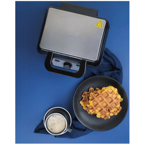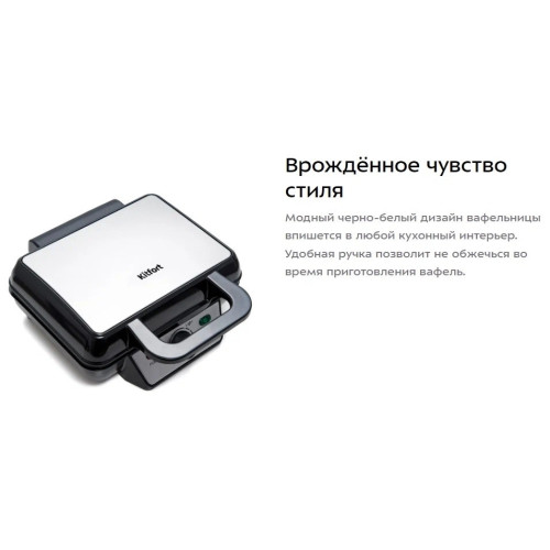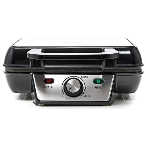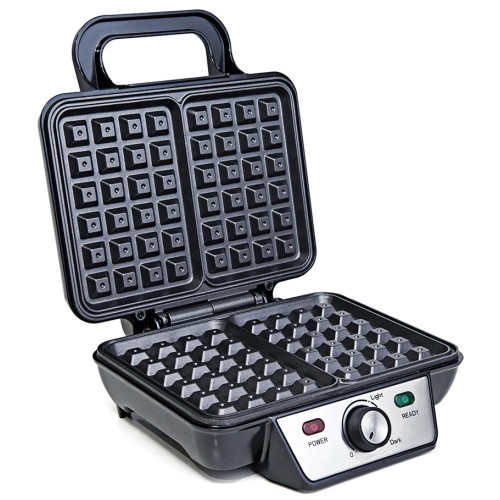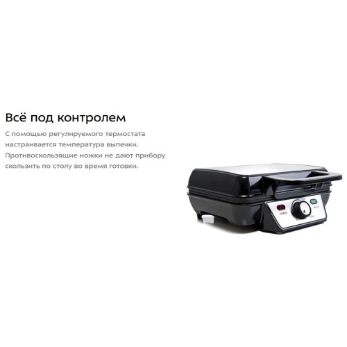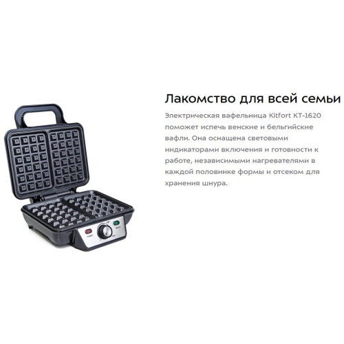 Электрическая вафельница поможет испечь венские и бельгийские вафли. Она оснащена световыми индикаторами включения и готовности к работе, независимыми нагревателями в каждой половинке формы и отсеком для хранения шнура. С помощью регулируемого термостата настраивается температура выпечки. Противоскользящие ножки не дают прибору скользить по столу во время готовки. Удобная ручка позволит не обжечься во время приготовления вафель.