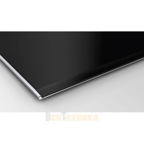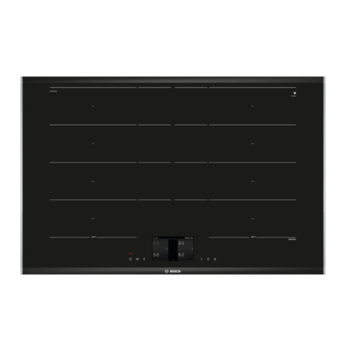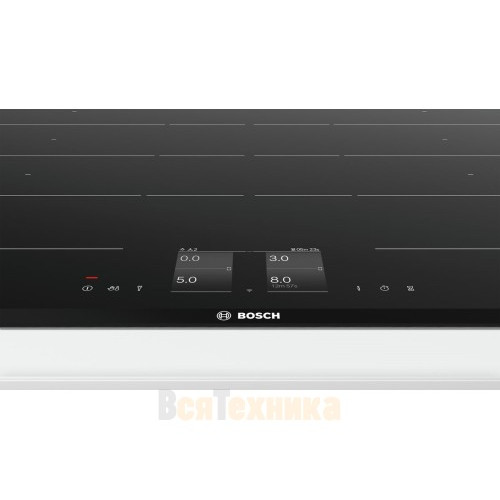 Bosch PXY875KV1E — это индукционная варочная поверхность на четыре конфорки, которые могу попарно объединяться в зоны FlexInduction. Выполнена из стеклокерамики чёрного цвета. Управляется при помощи сенсорных кнопок. Предусмотрено 17 ступеней нагрева.Зона нагрева FlexInduction объединяет четыре овальных индуктора, которые могут быть сгруппированы в две независимые конфорки или одну большую зону нагрева.