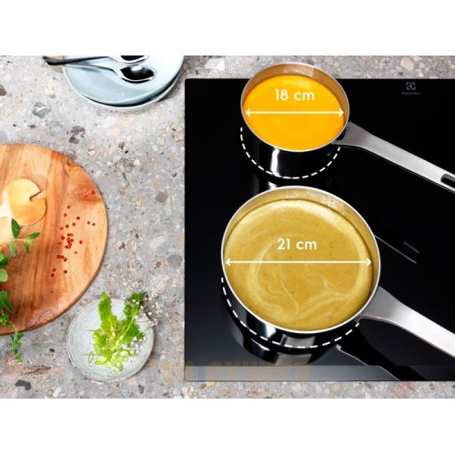 - Две гибкие зоны (14.5 см, 1.4 кВт каждая): Могут работать независимо или объединяться в одну удлиненную овальную зону (функция Dual Circuit) для использования посуды нестандартной формы (утятницы, сотейники).
