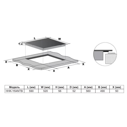 Панель выполнена в классическом черном цвете из прочного закаленного стекла, которое отличается высокой устойчивостью к механическим воздействиям и перепадам температур. Глянцевая поверхность не только эффектно выглядит, но и легко очищается от любых загрязнений. Встраиваемый дизайн (размеры 580x500 мм) делает модель универсальным решением для большинства стандартных кухонных столешниц.