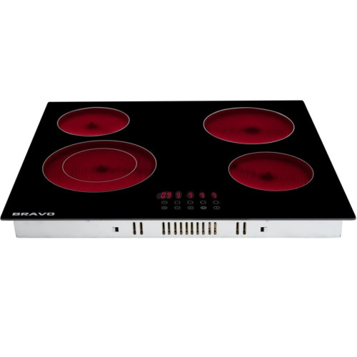 Стеклокерамическая варочная поверхность BRAVO - стильная, простая в уходе и понятная в управлении 4-х конфорочная встраиваемая панель, необходимая на кухне каждой современной хозяйке. Благодаря своим компактным размерам она впишется в дизайн любой кухни, но особенно хороша будет на современном стиле High-Tech. Электрическая встраиваемая варочная панель выполнена из стеклокерамики в классическом чёрном цвете и понравится хозяйкам своим насыщенным функционалом и понятным сенсорным управлением. Особенность данной электрической варочной панели - зона двойного нагрева Dual zone на одной из четырёх конфорок, что позволяет расширить потенциал плиты и использовать посуду для приготовления блюд различного диаметра (от 14 до 23 см). Защитная функция варочной панели - автоматическое отключение. Это происходит всякий раз, когда Вы забываете выключить конфорку. Имеется 9 уровней мощности, что поможет качественно приготовить любое блюдо. Встроенный таймер на 99 минут может работать как на отключение, так и в качестве таймера обратного отсчёта. В качестве дополнительной защиты (от детей, например) может быть использована блокировка поверхности, а индикатор остаточного тепла будет полезен по окончании эксплуатации панели. Стеклокерамические поверхности не требуют особых усилий и времени в ежедневном уходе, потому очень ценятся современными хозяйками. Готовьте любимые блюда с BRAVO!