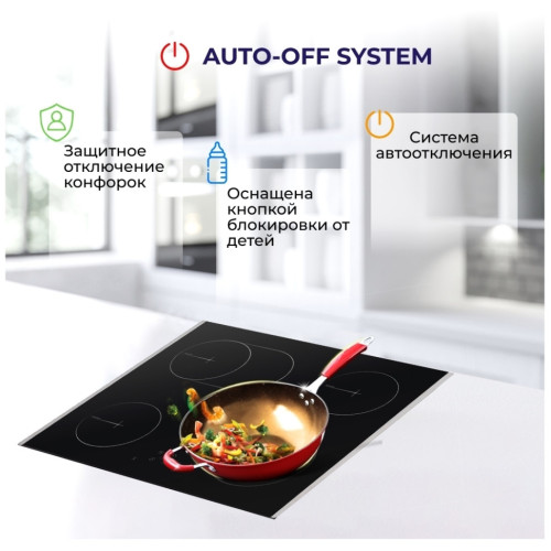 | Безопасность | защитное отключение конфорок, индикатор остаточного тепла, кнопка блокировки панели |