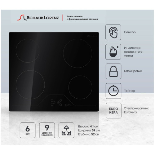 Электрическая варочная панель Schaub Lorenz SLK MY6414 - стильная, безопасная, простая в очистке модель для больших и малых кухонь Особенности модели Электрическая независимая варочная поверхность стеклокерамическая, ширина 60 см, стекло Eurokera (один из мировых лидеров по производству керамического стекла), 4*зоны ускоренного нагрева HI-Light, (2*? 145 мм 1200 Вт, 2*? 180 мм 1800 Вт), сенсорное управление, таймер с звуковым сигналом, 9 уровней мощности, таймер с автоотключением, блокировка от детей/ блокировка панели управления, индикаторы остаточного тепла, защитное отключение. Преимущества Стеклокерамика EuroKera Стеклокерамическое покрытие этой марки отличается высокой ударной стойкостью и не разрушается даже при падении на него тяжелой посуды. Варочные поверхности Schaub Lorenz с рабочим столом из стеклокерамики EuroKera не выгорают под воздействием высоких температур и не выцветают от ультрафиолета. Первоначальный цвет сохраняется на протяжении всего срока службы прибора. Варочные панели Schaub Lorenz из стеклокерамики EuroKera выдерживают высокие температуры и температурные перепады, легко очищаются от загрязнений и стильно выглядят в кухонном интерьере. Стеклокерамика EuroKera обладает еще одной уникальной особенностью – она хорошо проводит тепло по толщине и плохо – по ширине. Таким образом, сильно нагревается только конфорка, а не участки, расположенные рядом с ней. Варочные поверхности со стеклокерамическим рабочим столом встраиваются в столешницу и стильно смотрятся на фоне современного гарнитура и бытовой техники. Сенсорное управление Электрические и индукционные варочные поверхности Schaub Lorenz имеют сенсорное управление, и всего одним касанием можно отрегулировать все параметры. Вся информация о настройках выводится на цифровой дисплей. Основные опции представлены таймером отключения конфорок, индикаторами активного состояния и остаточного тепла. Индикация остаточного тепла После выключения конфорки индикатор сообщает о наличии остаточного тепла. Таким образом, можно экономно использовать остаточное тепло для завершения приготовления блюда или для поддержания блюда в теплом состоянии, а также уберечь себя от случайного прикосновения к еще не остывшей поверхности. Таймер Таймер позволяет задать время работы для каждой из конфорок. Благодаря этой удобной функции вы никогда не забудете выключить варочную панель вовремя. Блюдо не переварится, не пригорит и не «убежит». Таймер позволяет делать несколько процессов одновременно, не контролируя постоянно готовку, или заняться другими делами, например, уборкой, пока блюдо доходит до готовности. Функцию очень удобно использовать для блюд, которые требуют длительного приготовления при постоянной температуре, например, тушения овощей, мяса или изготовления домашних консервов. Таймер отключения, позволяющий автоматиз