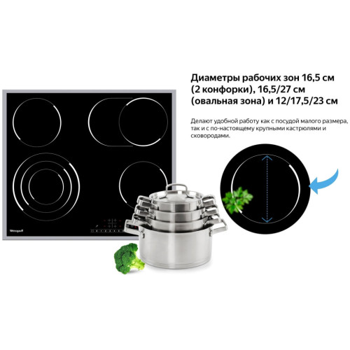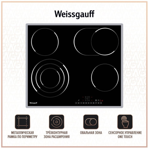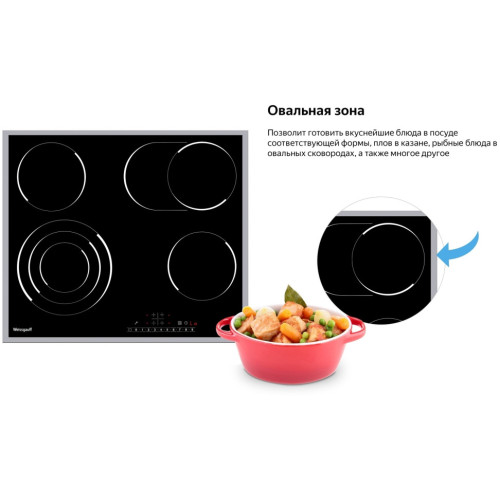 Варочная панель с металлической рамкой по периметру, переключаемой трёхконтурной конфоркой и овальной зоной "гусятницей" - это наиболее продвинутое и функциональное решение среди всех варочных панелей Weissgauff класса Hi-Light. Высококачественная стеклокерамика и чувствительное сенсорное управление со слайдером делают эту модель еще ближе к абсолютному совершенству. Металлическая рамка по периметру воплощает сочетание прекрасного стиля и практичности, не только защищая края варочной панели, но и дополняя её технологичный дизайн Трёхконтурная зона расширения даёт максимальную вариативность в выборе посуды для приготовления: от маленьких сотейников до самых крупных кастрюль. Овальная зона позволит готовить вкуснейшие блюда в посуде соответствующей формы, плов в казане, рыбные блюда в овальных сковородах, а также многое другое. Сенсорное управление One Touch, современное и оперативно реагирующее на ваши прикосновения с первого раза, даже в том случае, если руки холодные или влажные.