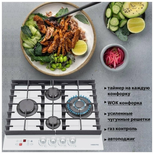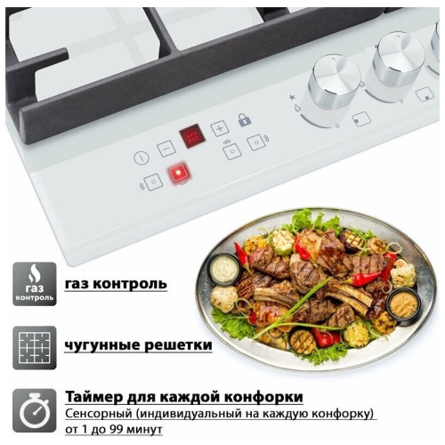 Газовую варочную панель HIBERG VM 6145 W со стильным и современным дизайном можно встроить в имеющийся гарнитур и создать цельную рабочую поверхность на вашей кухне. Рабочая поверхность выполнена из закаленного стекла – прочного и долговечного материала, на ней ромбовидно располагаются 4 конфорки, разные по диаметру и мощности огня. Если вы любите азиатскую кухню, то предусмотренная в данной модели WOK конфорка поможет вам в приготовлении любимых блюд. Мощность любой горелки можно регулировать с помощью поворотных переключателей, выбрав нужный из 6 режимов, для удобства пользования варочной панелью в переключатели встроен автоподжиг, который позволит одним нажатием руки легко включить нужную конфорку без использования спичек. Каждая конфорка варочной поверхности HIBERG VM 6145 W оснащена функцией газ-контроль, которая обезопасит пользователя от вероятности воспламенения при утечке газа. Кроме того, в данной модели предусмотрен сенсорный индивидуальный таймер для каждой конфорки с возможностью отключения по заданному времени: от 1 до 99 минут. Поверх конфорок на варочной панели установлены привлекательные массивные и прочные чугунные решетки, которые не подвержены воздействию высоких температур и отличаются длительным сроком службы. Особенности и преимущества: - современный дизайн рабочей поверхности в цвете «белое стекло»; - электроподжиг; - газ-контроль; - WOK конфорка; - сенсорный таймер (индивидуальный для каждой конфорки); - чугунные решетки; - легкость в уходе. Выбирая технику HIBERG , вы выбираете премиум качество, надежность и комфорт!